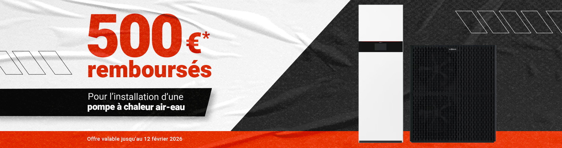 Offre valable pour toute installation d’une pompe à chaleur air-eau Viessmann effectuée par un professionnel certifié jusqu’au 12 février 2026. Le remboursement est soumis à la fourniture de la facture d’installation et d’un dossier complet transmis dans les 30 jours suivant la mise en service.